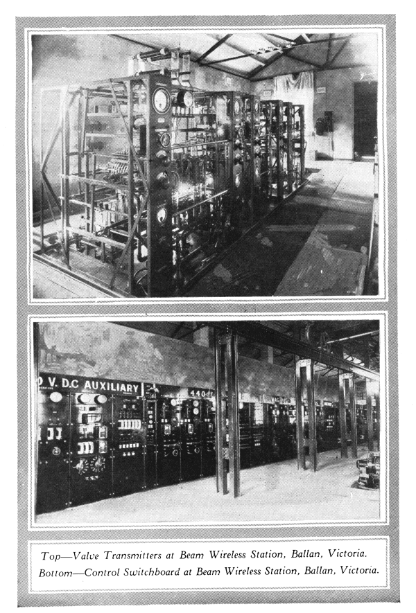 The Beam wireless transmitting centre in Australia is located near Ballan - about 50 miles to the N.W. of Melbourne, and the receiving centre is at Rockbank - l8 miles from Melbourne in the same direction. Both stations are connected by special telegraph lines with the Beam Wireless Office, 167 Queen Street, Melbourne, and with the Beam Wireless Office, 47 York Street, Sydney. At Ballan there are two transmitters - one of which is used for sending messages to London, whence they are distributed through the United Kingdom to Europe, and the other transmits to Montreal all messages for the North and South American Continents.